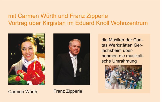 Am Dienstag, den 9. Oktober 2012 werden Frau Würth und Herr Zipperle zu uns ins Eduard-Knoll-Wohnzentrum kommen. Die beiden möchten ab 14 Uhr im Veranstaltungsraum über ihren Besuch in Kirgistan berichten.