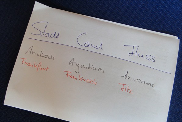 Heute Nachmittag spielen wir wieder: Beim beliebten Spiel Stadt-Land-Fluss kommt es auf ungewöhnliche Begriffe und Schnelligkeit an. Wer am Schluss die höchste Punktzahl erreicht, hat gewonnen.