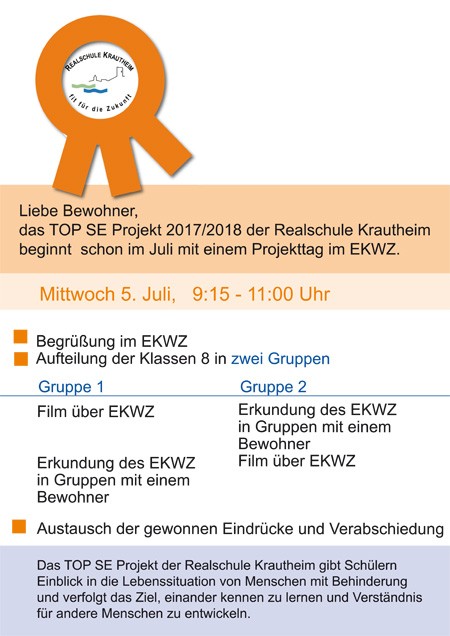 Projekttag im EKWZ. Das TOP SE Projekt der Realschule Krautheim gibt Schülern Einblick in die Lebenssituation von Menschen mit Behinderung und verfolgt das Ziel, einander kennen zu lernen und Verständnis für andere Menschen zu entwickeln.