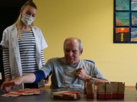 Michael: Also warum wir jetzt hier sind, du hast es schon erwähnt, wegen der Coronakrise. Normal arbeiten viele Bewohner hier aus dem Wohnzentrum drüben in der Werkstätte. Durch die Coronakrise sind jetzt alle Leute hier im Wohnzentrum und die Geschäftsführung vom EKWZ und von der Werkstätte haben gemeinsam bereinbart, dass die WfbM einfach hier dem EKWZ aushelfen kann, dass hier zusätzlich noch ein Angebot gemacht werden kann für die Leute, dass sich noch eine Möglichkeit ergibt eine Tagesstruktur zu bieten.